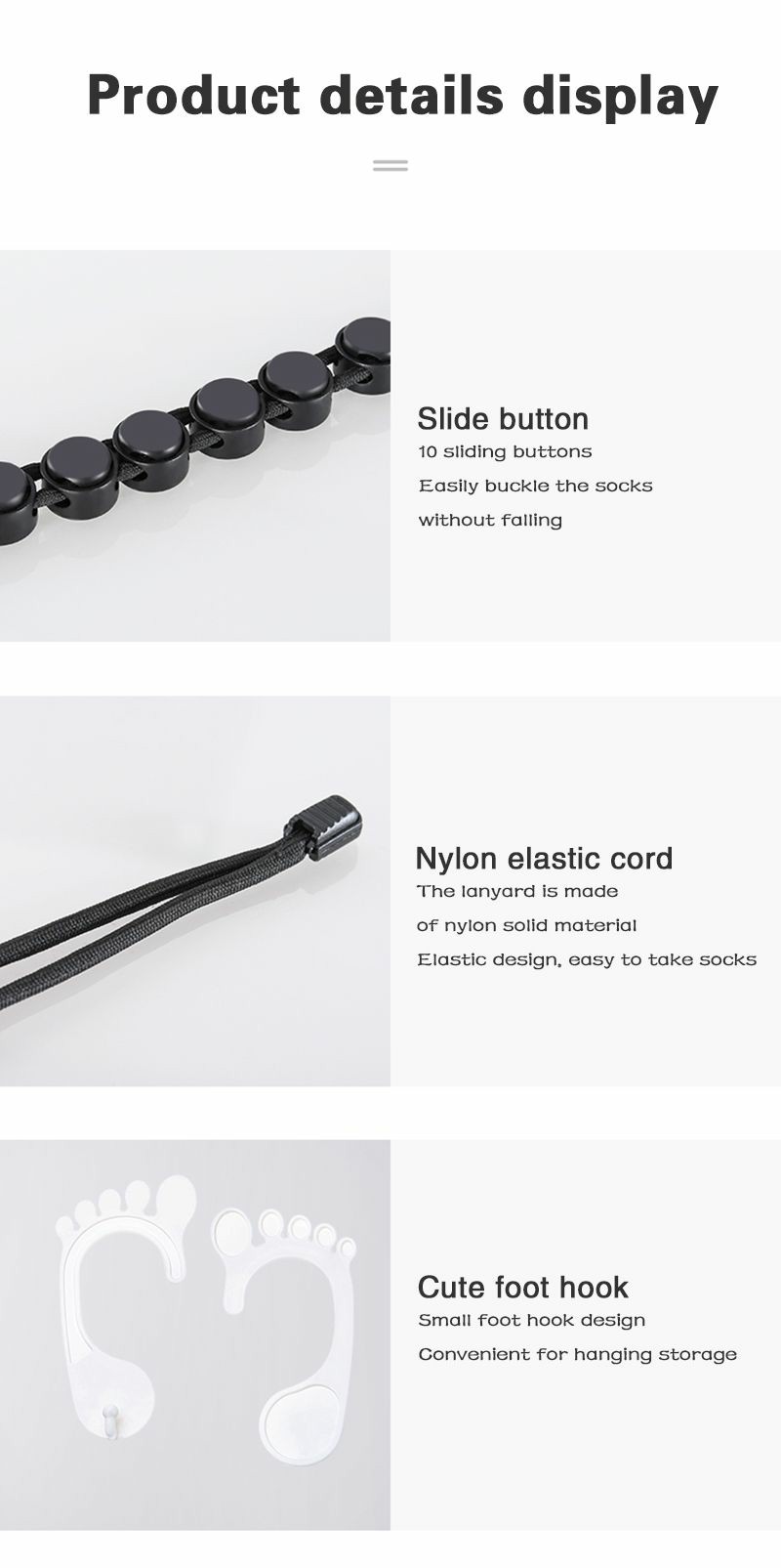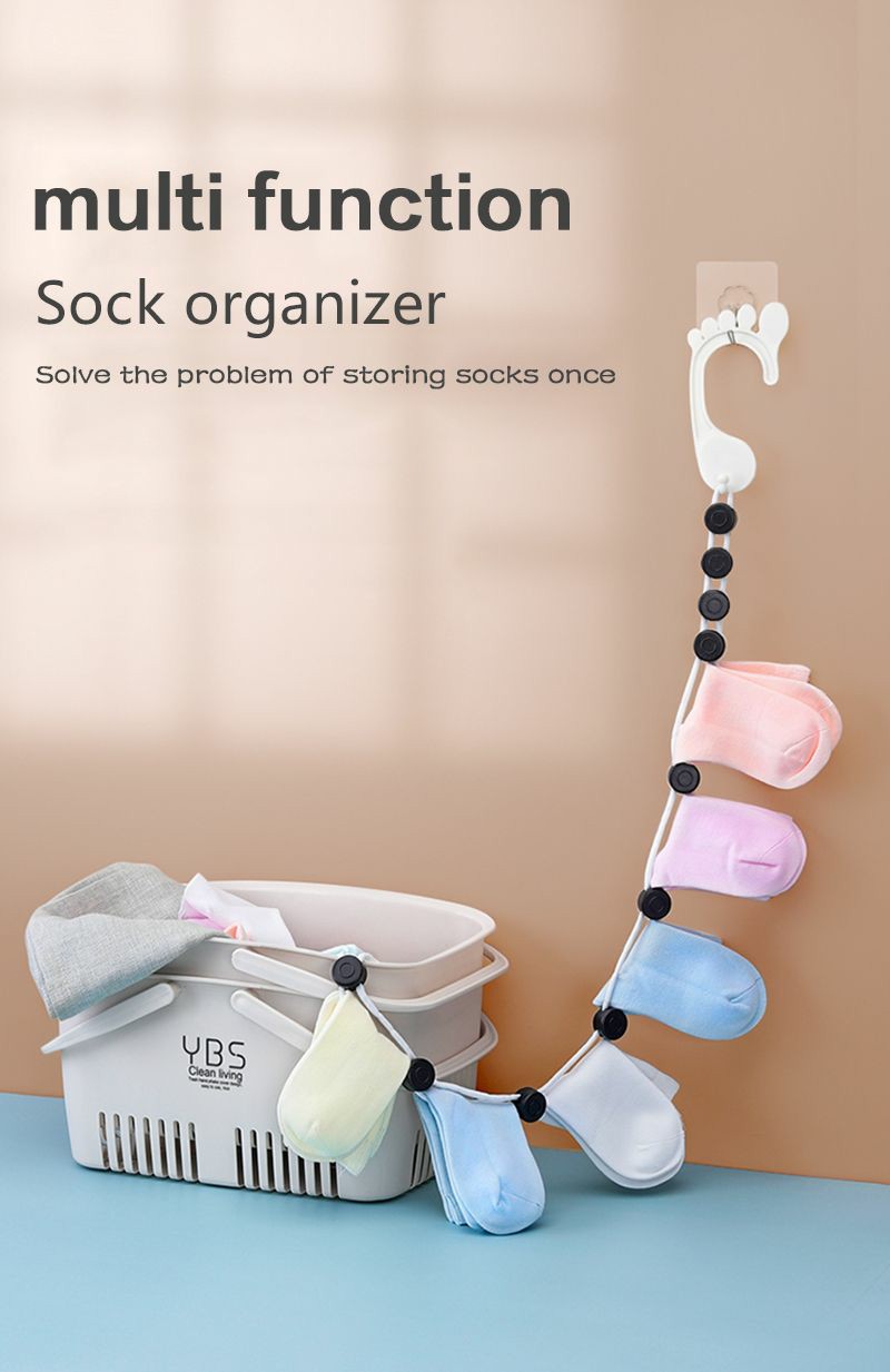 Three functions of storage, drying and cleaning are integrated. What is the worst part of doing laundry? It's searching for matching socks. If you are sick of searching for matching socks, then look no further, the Sockdock is here. This is a very convenient washing artifact can clip on 10 pairs of socks at the same time, washing at the same time, convenient and quick. Machine wash not messy, air basks in more convenient, but also to avoid the possibility of socks was blown down. Real done washing in one. Can also be used on the chest, can hang clothes, at the same time can save a space flexible card buckle and lovely feet hook design, let the artifact not only beautiful but also very practical. Packaging specifications: 21 * 17 * 2.3 cm; product weight: 73g; rope length: 70 cm.